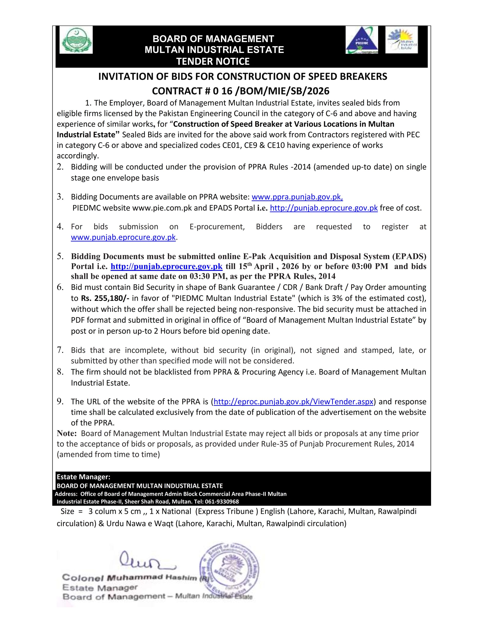 Construction of Speed Breaker at Various Locations in Multan Industrial Estate